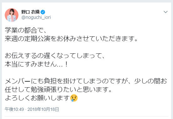 イコラブ 10月26日定期公演 野口衣織が学業の都合でお休みになる事について(山本杏奈SR配信より)